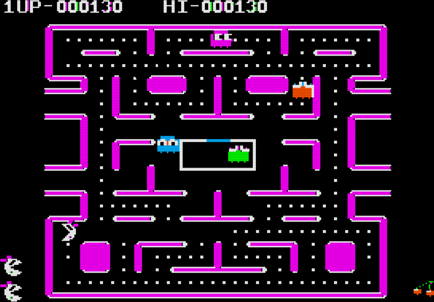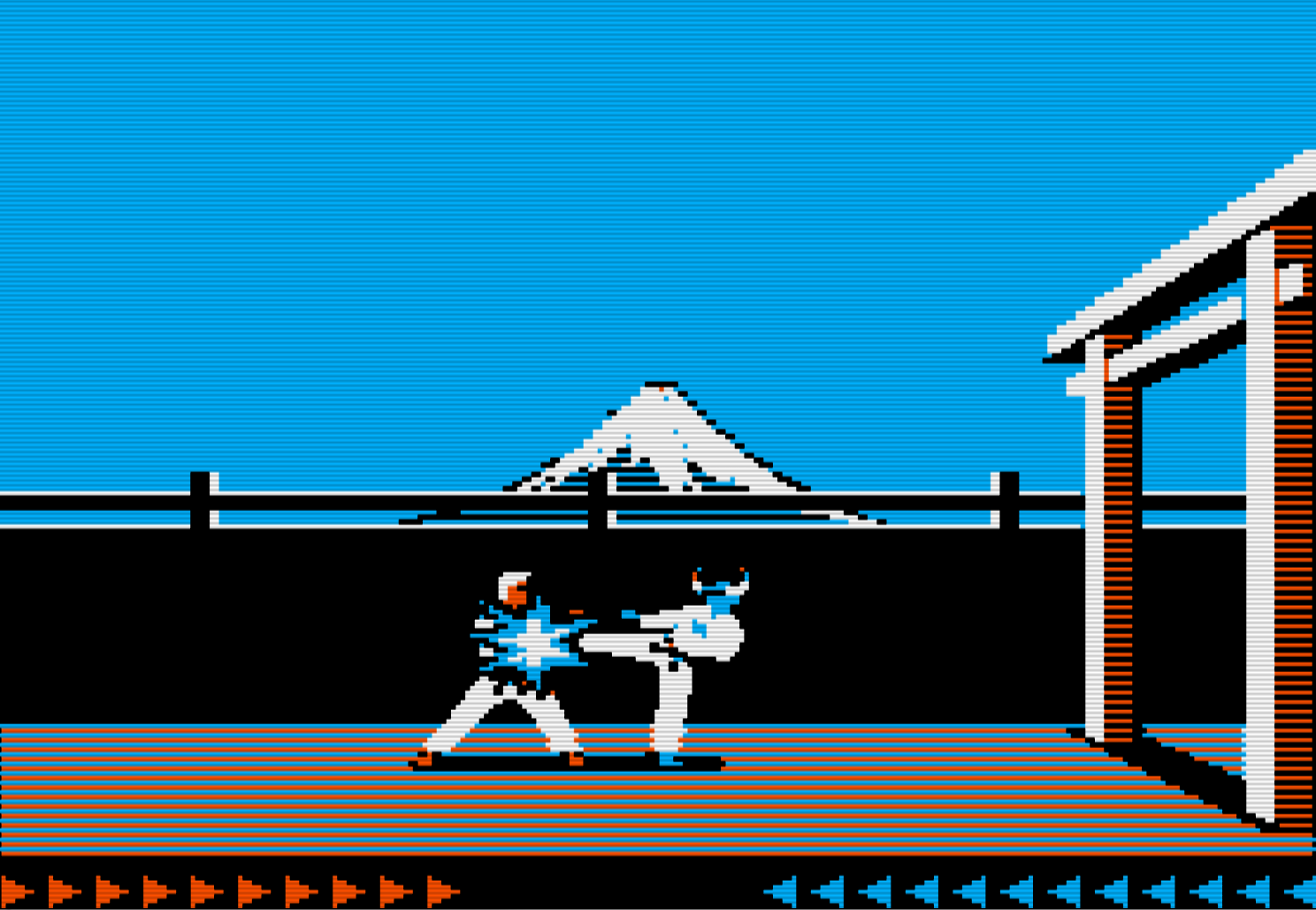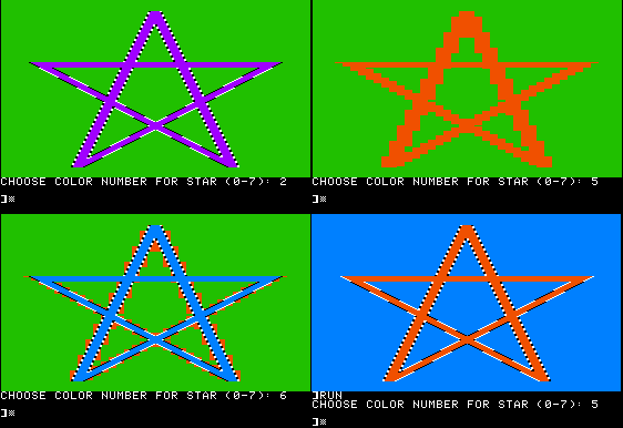 However, the colour palette (purple and green or blue and orange) could only be changed every seven pixels (with the eighth bit in each video byte used to determine the palette). This made using all four non-monochrome colours on-screen at once a bit tricky, since one could inadvertently change the colour of adjacent pixels. Also, where two different “coloured” 2-bit (01, 10, etc.) pixels sat side-by-side, you could get “fringing” or artefacting caused by the last bit of the first pixel and the first bit of the second pixel being interpreted by the monitor (or TV – or emulator) as its own different-coloured pixel!