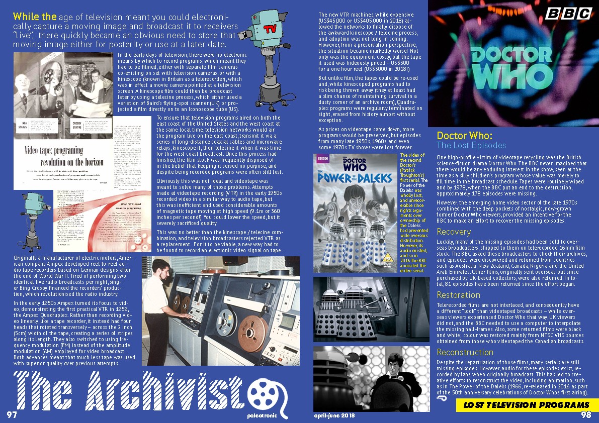 One high-profile victim of videotape recycling was the British science-fiction drama Doctor Who. The BBC never imagined that there would be any enduring interest in the show, seen at the time as a silly children’s program whose value was merely to fill time in the broadcast schedule. Tapes were routinely wiped and by 1978, when the BBC put an end to the destruction, approximately 178 episodes were missing.