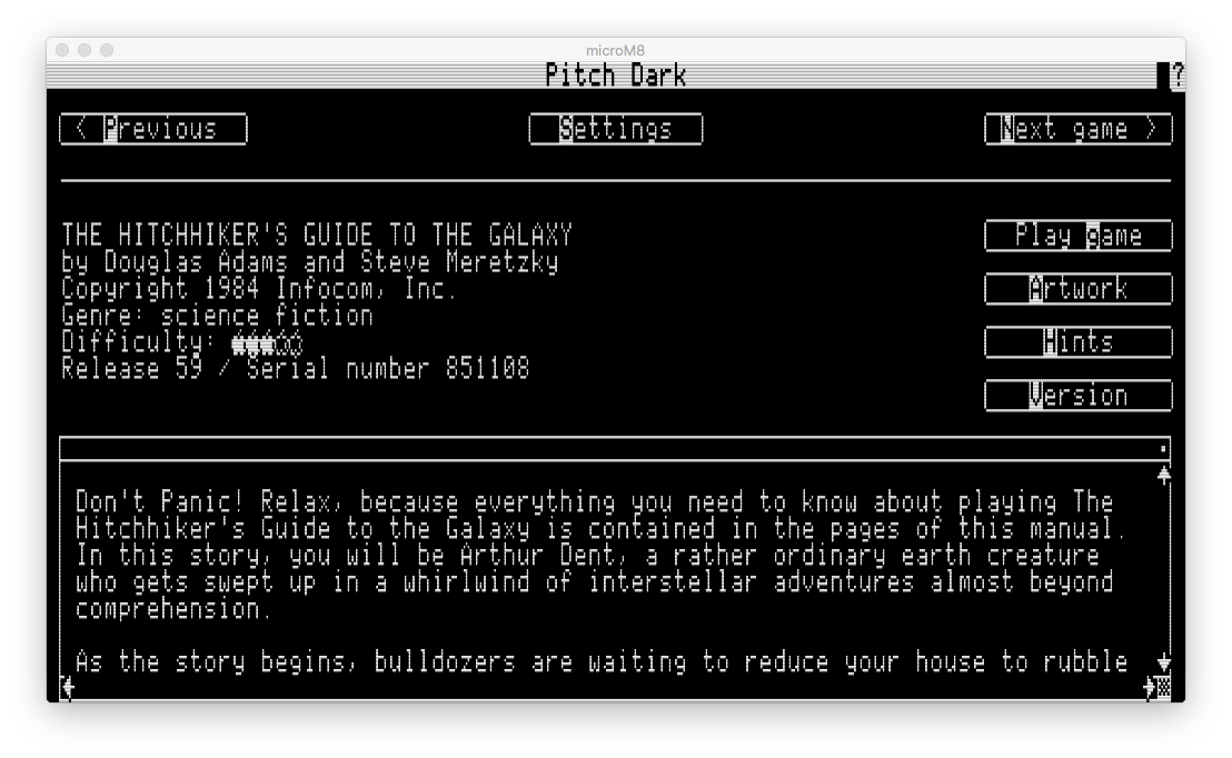 You can now use “Smartport”-based large volume images with microM8 (HDV, 2MG and 800K PO), via the file catalog or drag-and-drop. We’ve also uploaded a variety of images to the built-in cloud library including Pitch Dark, 4am’s Infocom text-adventure compendium (which was the reason for the feature update)…
