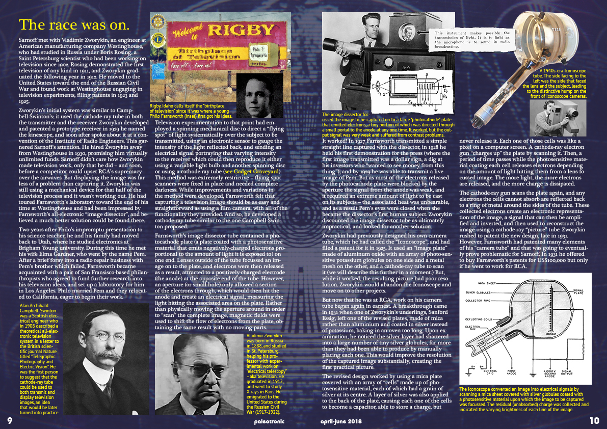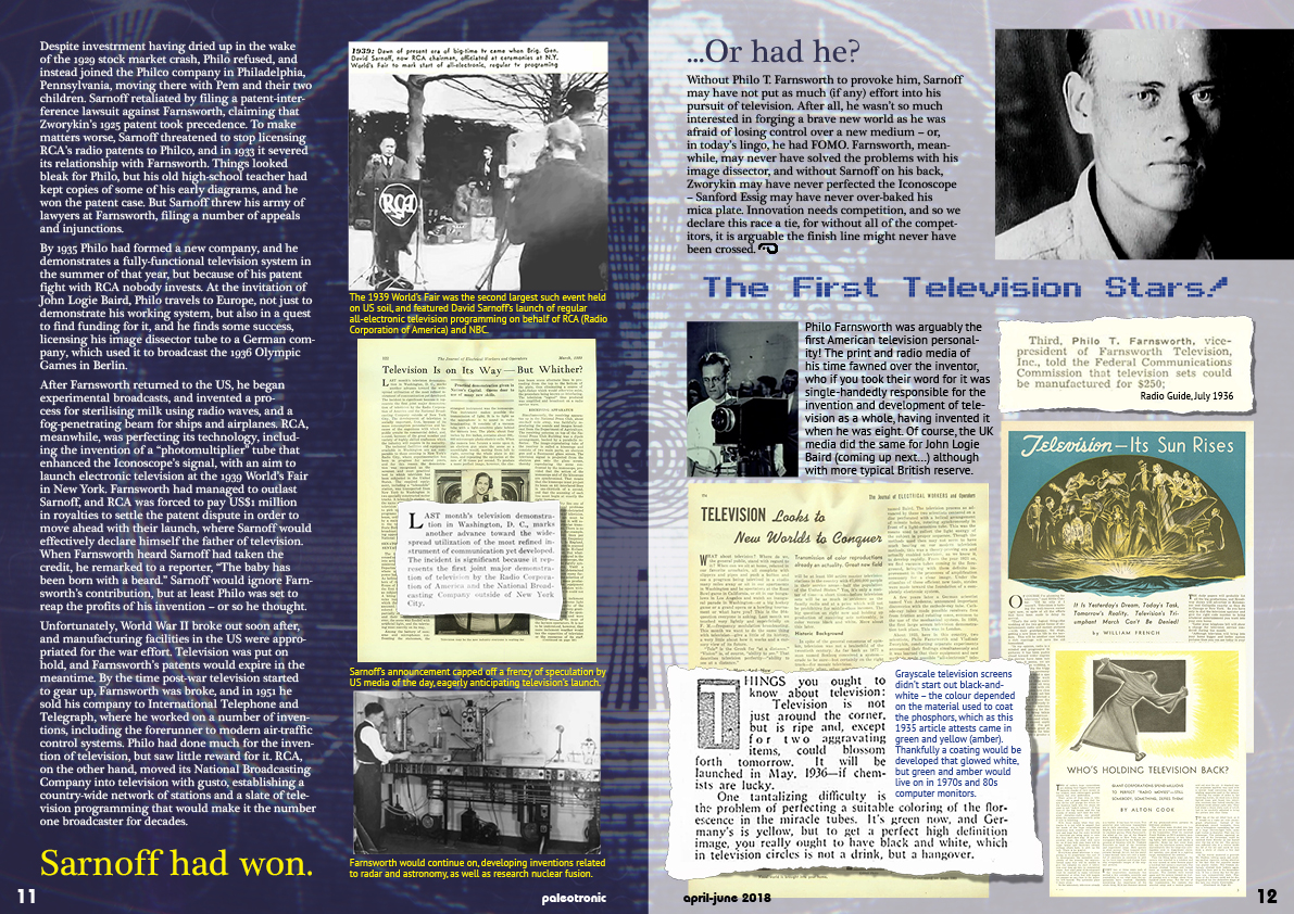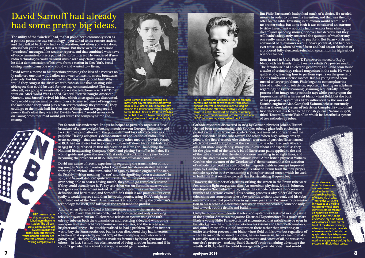 Campbell-Swinton’s theoretical television system was featured in a 1915 issue of the popular American magazine Electrical Experimenter. It is much more likely a young Philo Farnsworth had encountered that article (maybe even in his attic), given the similarities between his system and Campbell-Swinton’s, and gained most of his initial inspiration there rather than inventing an entire television process in an Idaho wheat-field on his own, but regardless of where Farnsworth obtained his ideas, he was American; he was first to make it actually work (a remarkable achievement); and, worst of all, he was someone else’s property – making David Sarnoff’s only remaining advantage the wealth of RCA, which he could leverage with great abandon…and would.