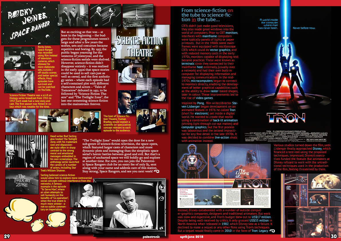 “The Twilight Zone” would open the door for a new sub-genre of science-fiction television, the space opera, which featured larger casts of characters and more dynamic plots and messaging than the simplistic space serial’s heroic battles between good and evil. But that’s a region of uncharted space we will boldly go and explore at another time. For now, you can join the Paleotronic Space Rangers club for an entry fee of only $5, sent along with your name and address care of this station. Stay strong, Space Rangers, and see you next week!