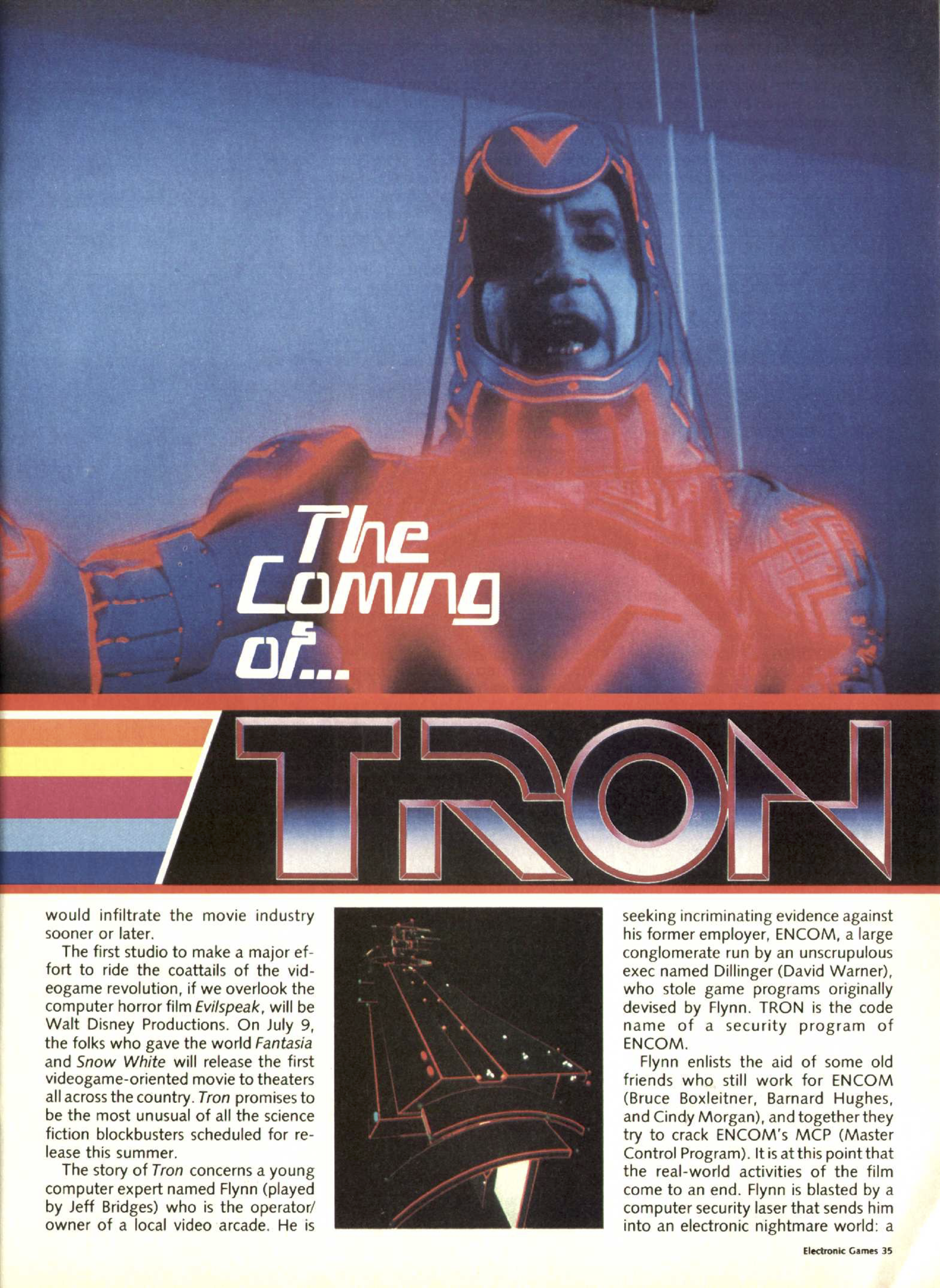 Inspired by Pong, film writer/director Steven Lisberger began development on an animated feature in 1976 he called Tron (short for electronic) set inside a digital world. He wanted to create that world using a combination of back-lit animation (shining light through cut-out mattes) and computer graphics, but the first process was labourious and the second impractical for any fine detail in the late 1970s. It was decided to combine live-action shots with animation instead.