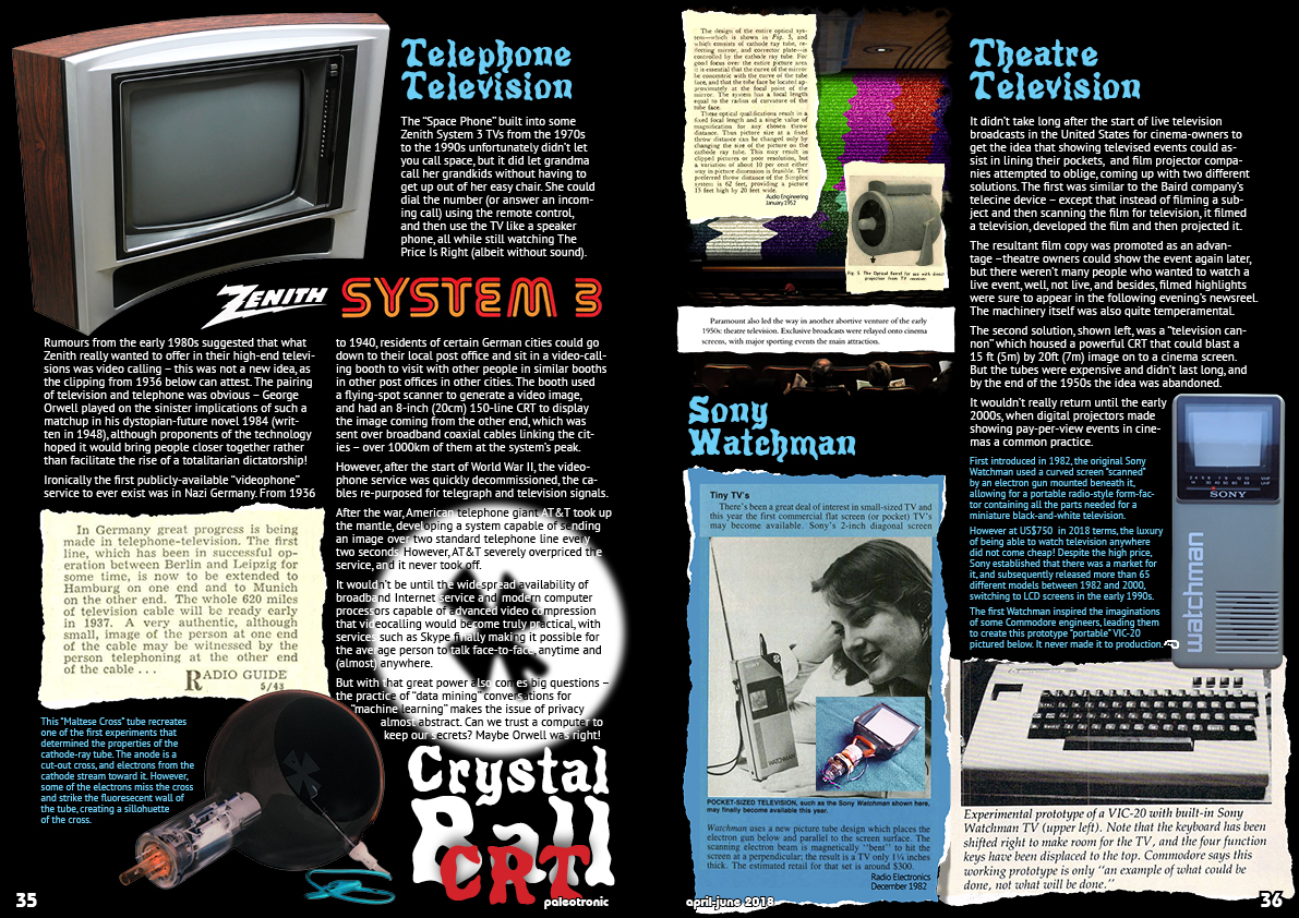 Rumours from the early 1980s suggested that what Zenith really wanted to offer in their high-end televisions was video calling – this was not a new idea, as the clipping from 1936 below can attest. The pairing of television and telephone was obvious – George Orwell played on the sinister implications of such a matchup in his dystopian-future novel 1984 (written in 1948), although proponents of the technology hoped it would bring people closer together rather than facilitate the rise of a totalitarian dictatorship!