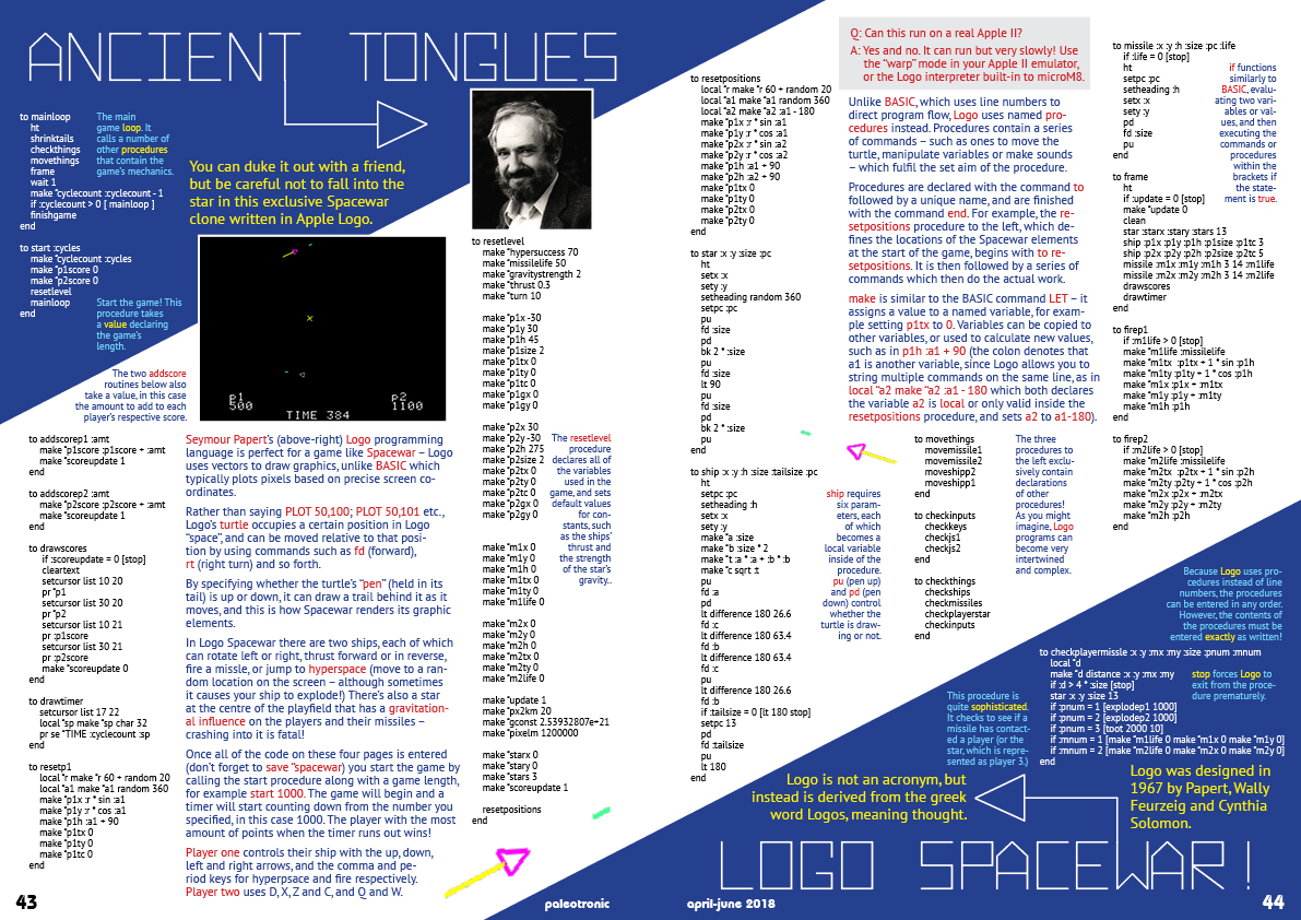Seymour Papert’s Logo programming language is perfect for a game like Spacewar – Logo uses vectors to draw graphics, unlike BASIC which typically plots pixels based on precise screen coordinates.