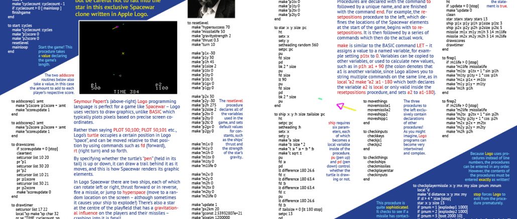You can duke it out with a friend, but be careful not to fall into the star in this exclusive Spacewar clone written in Apple Logo. Seymour Papert’s Logo programming language is perfect for a … Continue reading Ancient Tongues: Logo Spacewar!