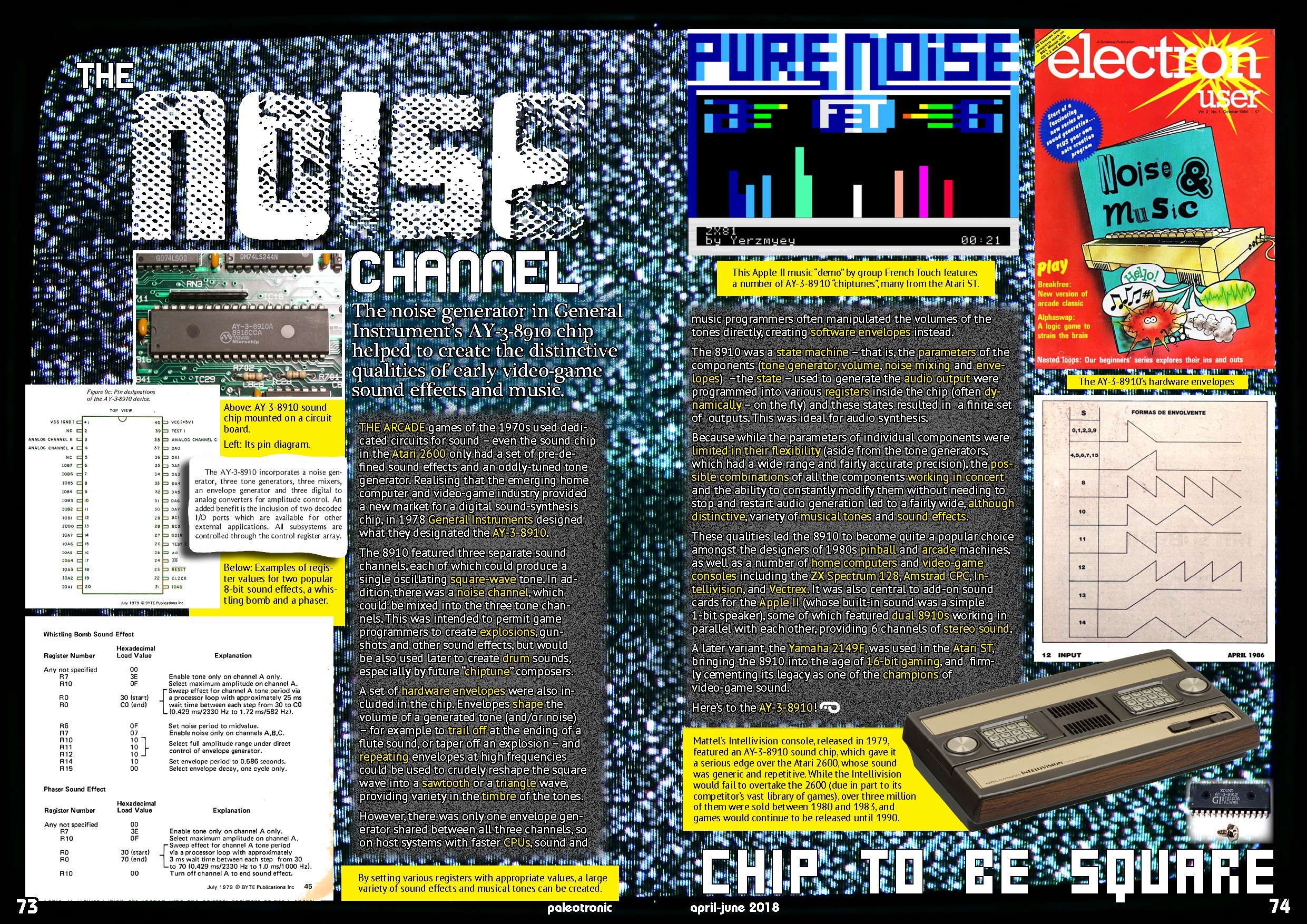 THE ARCADE games of the 1970s used dedicated circuits for sound – even the sound chip in the Atari 2600 only had a set of pre-defined sound effects and an oddly-tuned tone generator. Realising that the emerging home computer and video-game industry provided a new market for a digital sound-synthesis chip, in 1978 General Instruments designed what they designated the AY-3-8910.