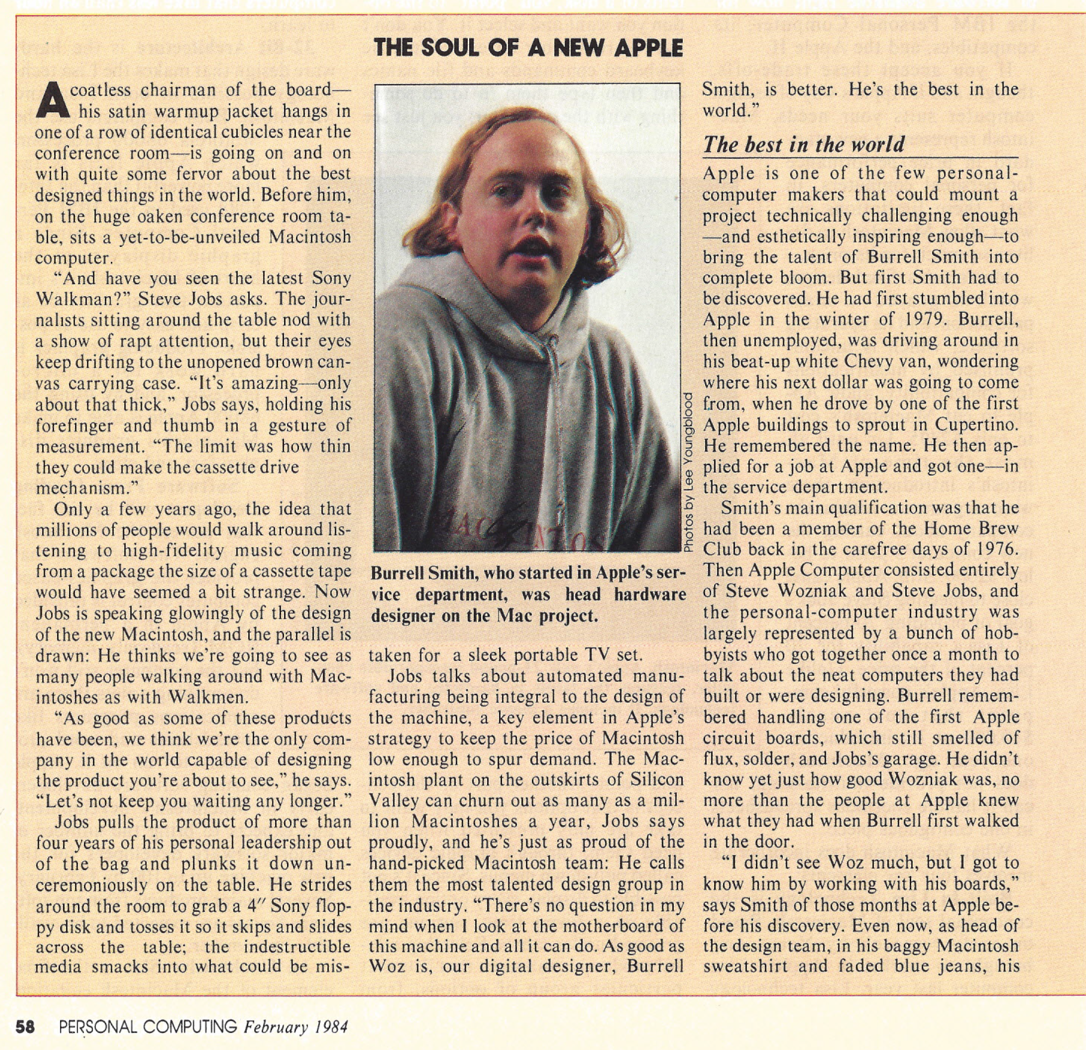 Steve Jobs may have liked to take the credit for the Macintosh, but its motherboard was the result of another hippy’s creative genius, that of Burrell Smith. A member of the Home Brew Computer Club along with Steve Wozniak back in 1976, he turned up in ‘79 at Apple HQ looking for a job, and got one – in the service department. But his talents would not go unrecognised for long, soon landing on the Macintosh team.