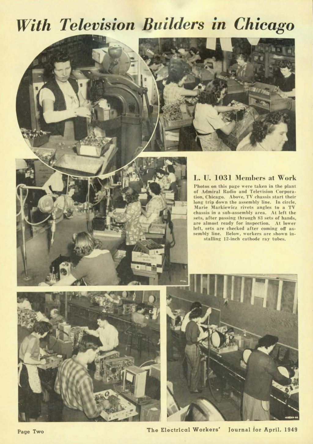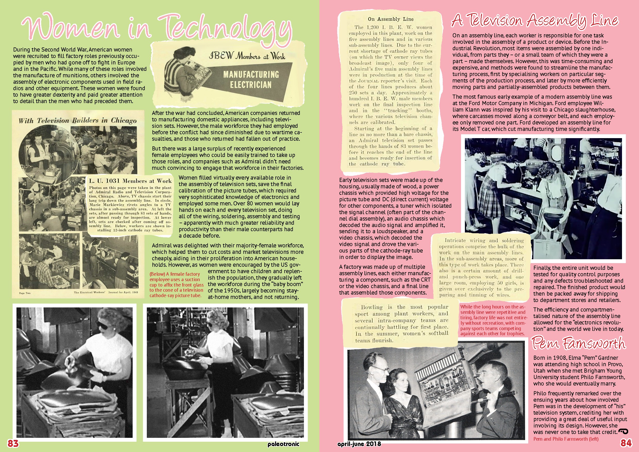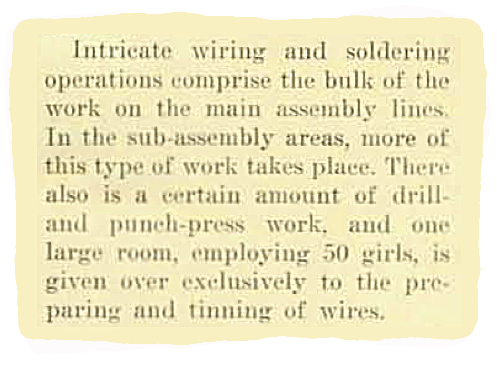 Women filled virtually every available role in the assembly of television sets, save the final calibration of the picture tubes, which required very sophisticated knowledge of electronics and employed some men. Over 80 women would lay hands on each and every television set, doing all of the wiring, soldering, assembly and testing – apparently with much greater reliability and productivity than their male counterparts had a decade before.