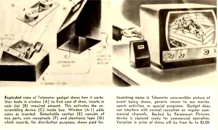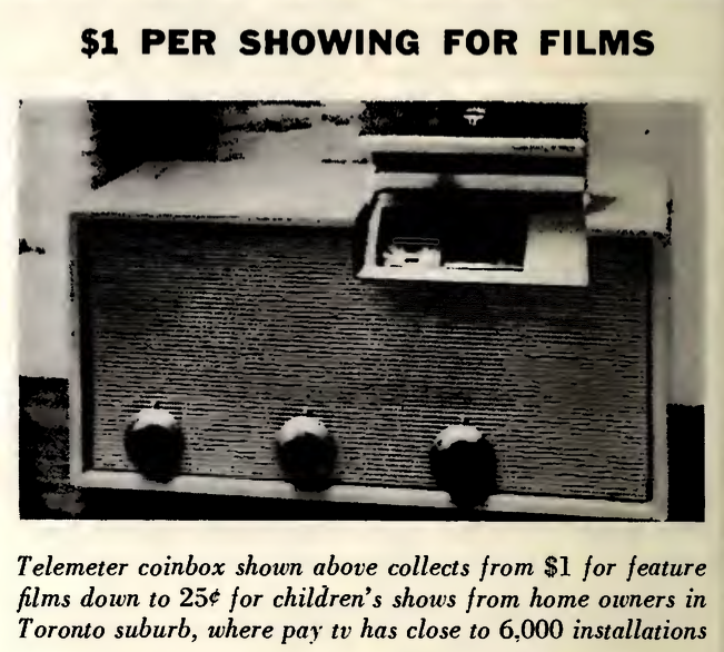 Part-owned by movie studio Paramount, Telemeter was trialled in Palm Springs, California, in 1953. Customers could put US$1.25 into the box to watch first-run films and sporting events, such as boxing. However, local theatre owners became extremely unhappy at the prospect of competing with the service, and it was shut down after just six months.