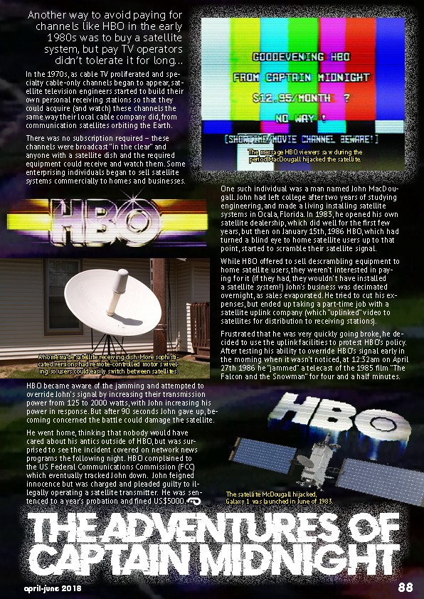 One such individual was a man named John MacDougall. John had left college after two years of studying engineering, and made a living installing satellite systems in Ocala, Florida. In 1983, he opened his own satellite dealership, which did well for the first few years, but then on January 15th, 1986 HBO, which had turned a blind eye to home satellite users up to that point, started to scramble their satellite signal.
