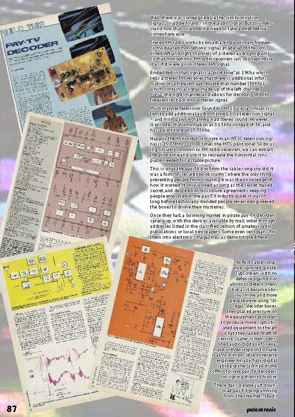 Once they had, a booming market in pirate pay-TV decoders sprang up, with the devices available by mail order through addresses listed in the classified section of amateur radio publications or local newspapers. Some even sent plans for them into electronics magazines, as demonstrated here.