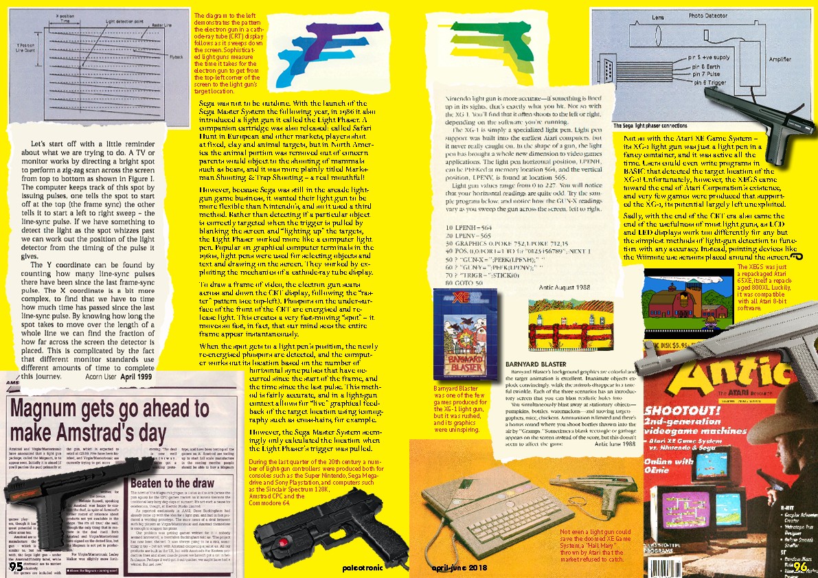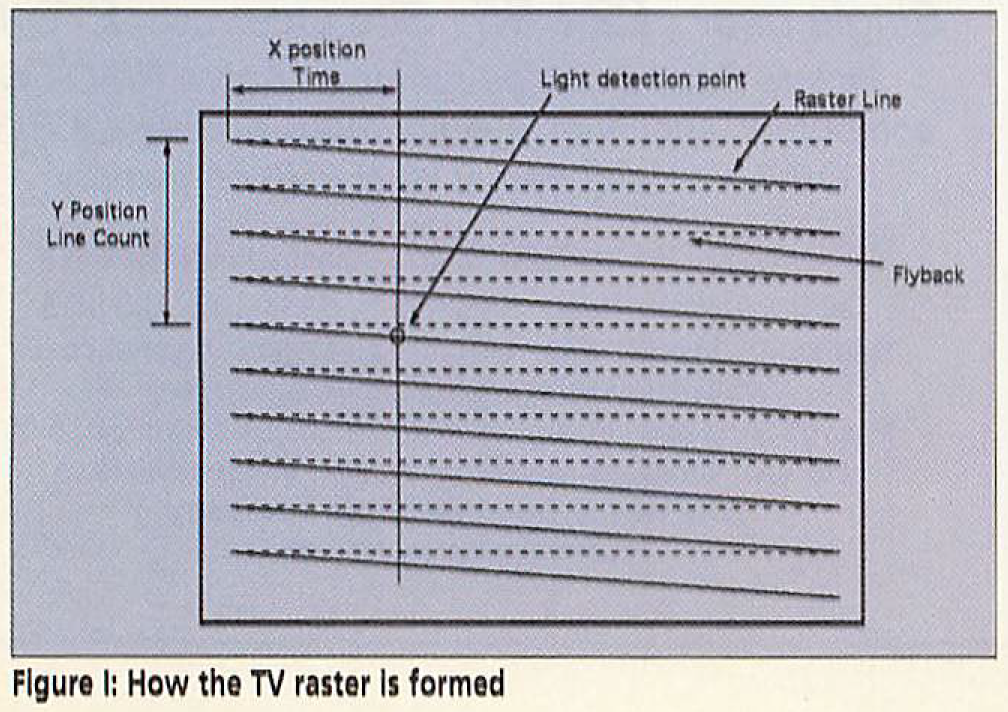 When the spot gets to a light pen’s position, the newly re-energised phospors are detected, and the computer works out its location based on the number of horizontal sync pulses that have occurred since the start of the frame, and the time since the last pulse. This method is fairly accurate, and in a light-gun context allows for “live” graphical feedback of the target location using iconography such as cross-hairs, for example. However, the Sega Master System seemingly only calculated the location when the Light Phaser’s trigger was pulled.