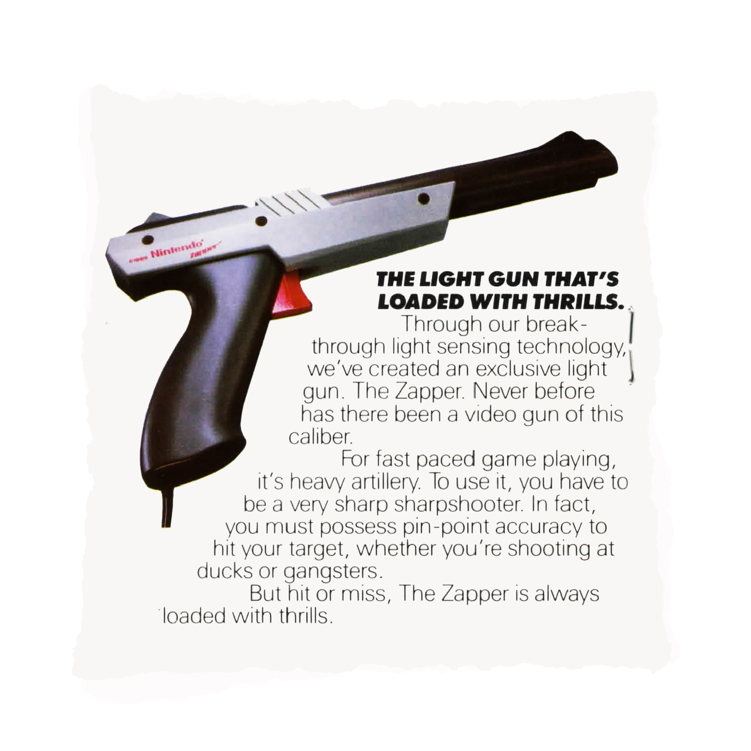 Two extras were eventually chosen to be launched with the console: a toy robot called R.O.B., and a light gun – the Zapper. To be as family-friendly as possible, the Zapper’s companion game was Duck Hunt, an animated duck and clay-shooting game “hosted” by a humorous hunting dog that mercilessly mocked the player whenever they failed to shoot any targets (darn that dog!) Due to the simplistic nature of the light gun, most Zapper games use large, spread-out targets, such as Hogan’s Alley, available for purchase separately at the NES’s launch in 1985.