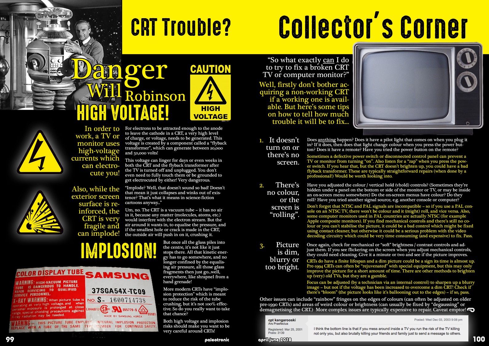 Other issues can include “rainbow” fringes on the edges of colours (can often be adjusted on older pre-1990 CRTs) and areas of weird colour or brightness (can usually be fixed by “degaussing” or demagnetising the CRT.) More complex issues are typically expensive to repair. Caveat emptor!