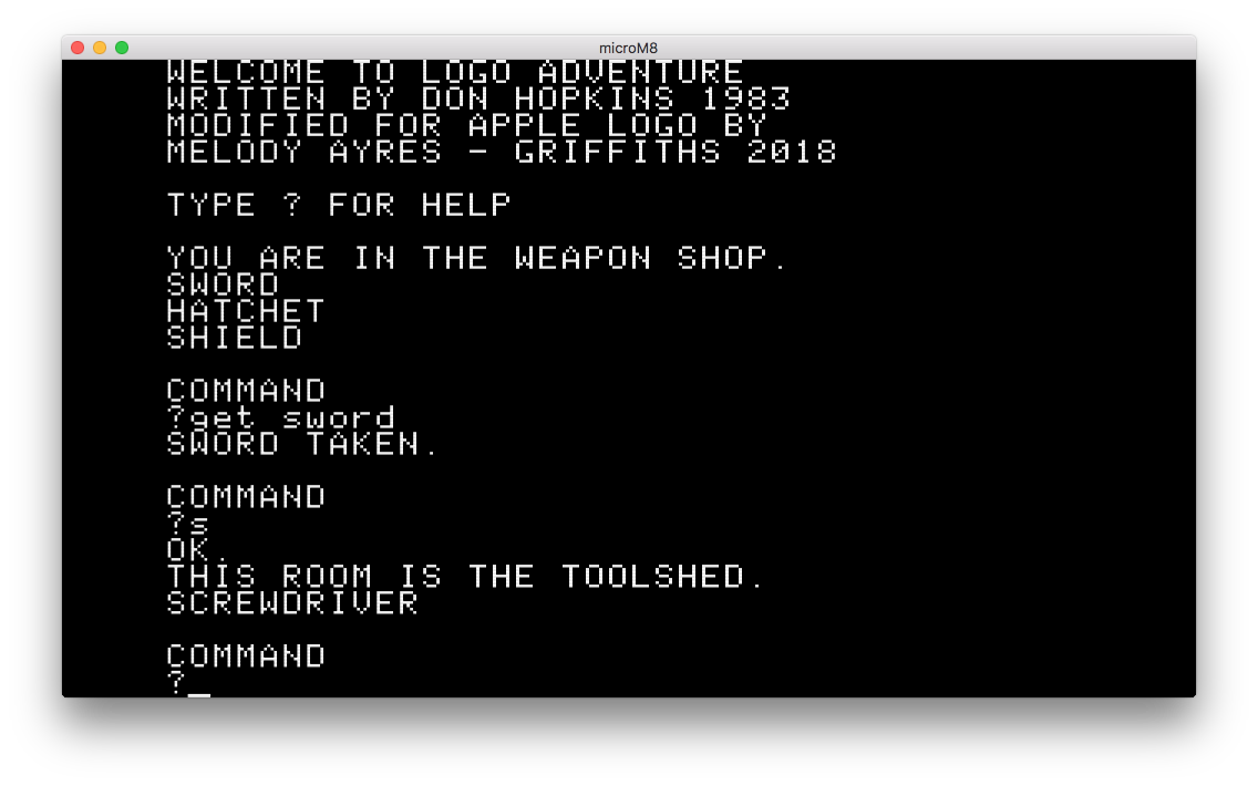 Don Hopkins recently posted his clever Logo Adventure for C64 Terrapin Logo, a skeleton of an adventure game that uses Logo’s own parser as the parser for the game, by defining commands as procedures and using a few neat tricks to manage objects. I wondered if the listing could be ported to Apple Logo (and if it would still work) and after some poking and prodding, I found out it does!