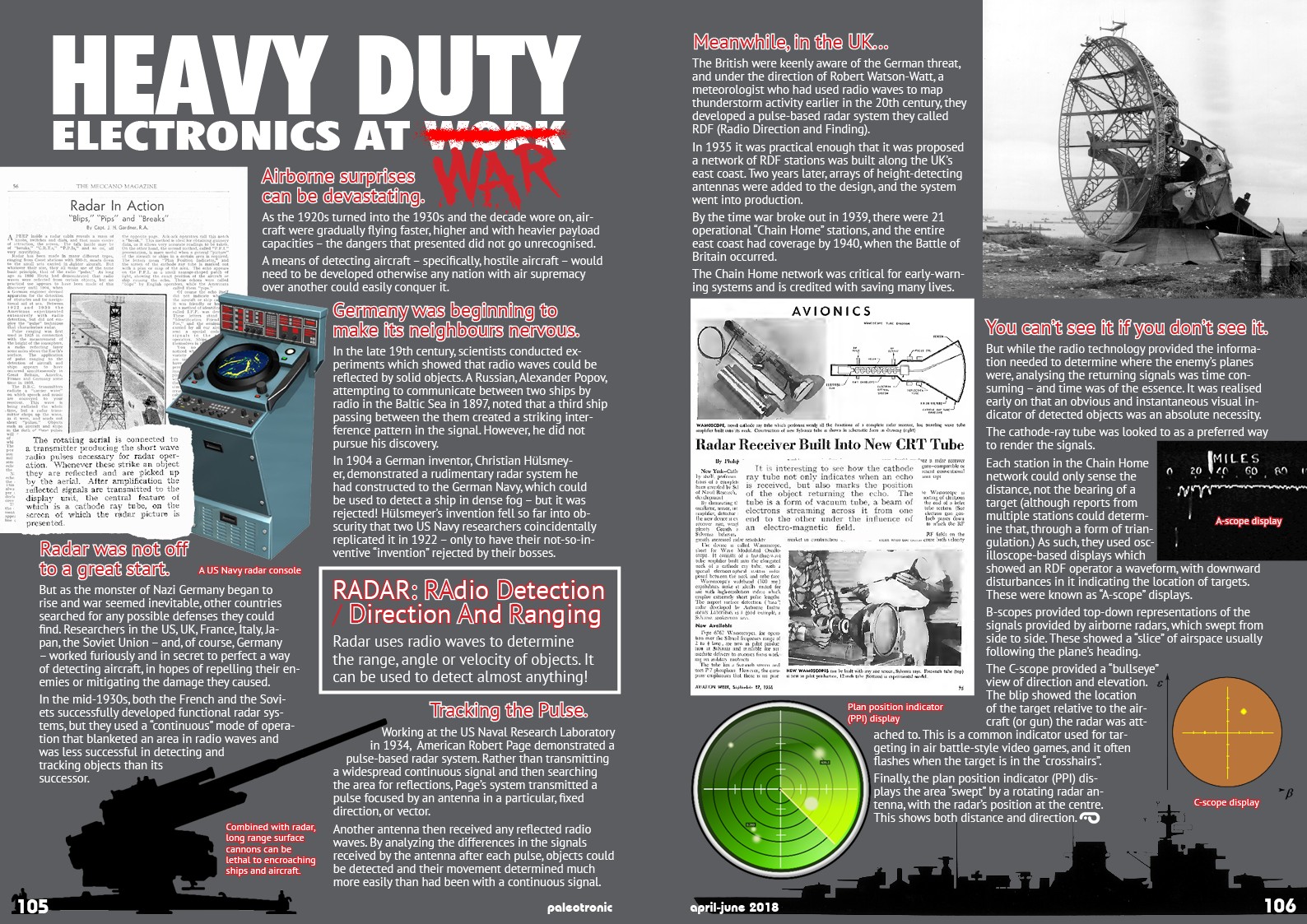 Working at the US Naval Research Laboratory in 1934, American Robert Page demonstrated a pulse-based radar system. Rather than transmitting a widespread continuous signal and then searching the area for reflections, Page’s system transmitted a pulse focused by an antenna in a particular, fixed direction, or vector.