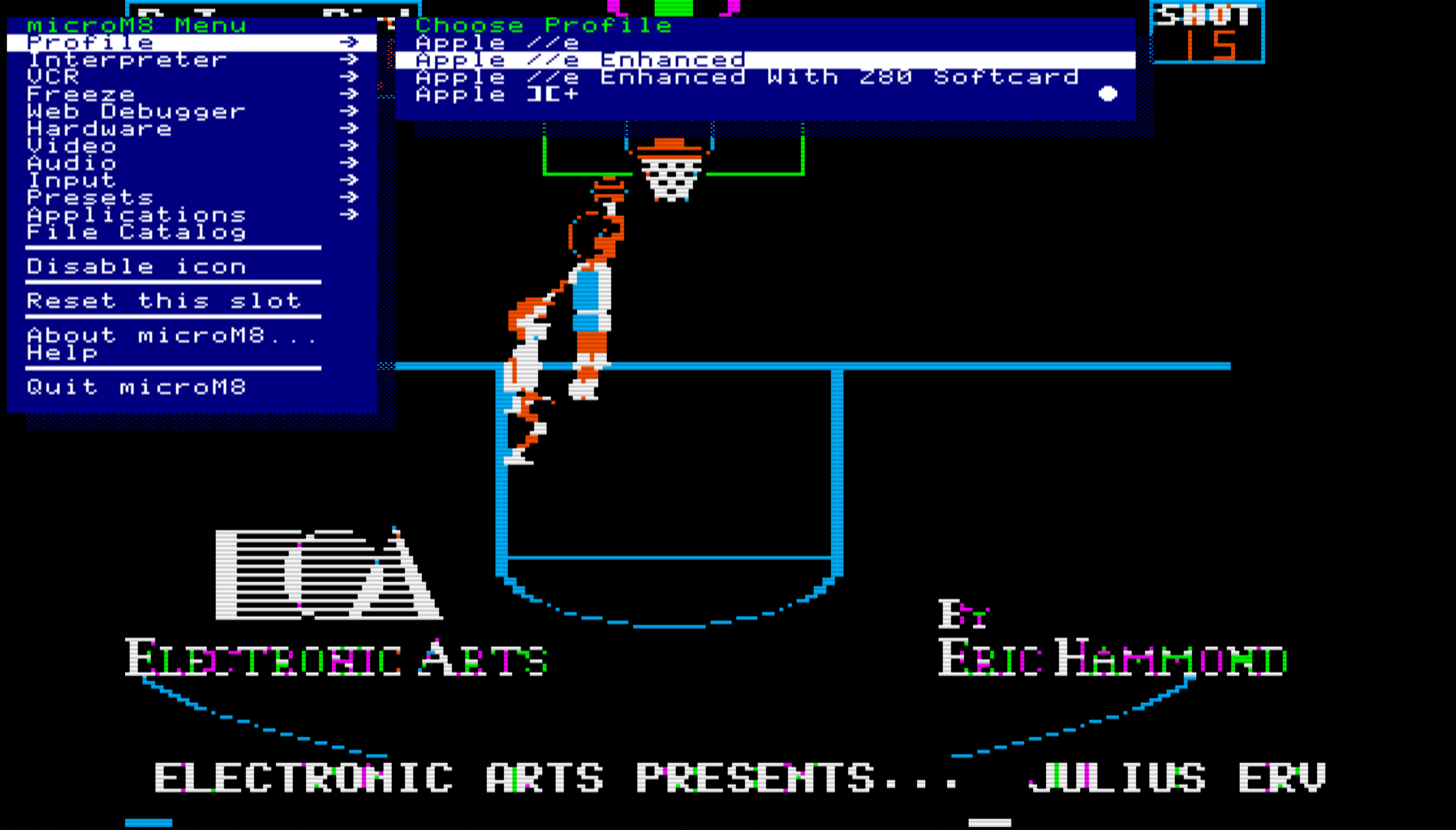 This menu also contains options to switch to different machine profiles (eg Apple II+) and format blank floppy disks, functions which are not available via control keys.